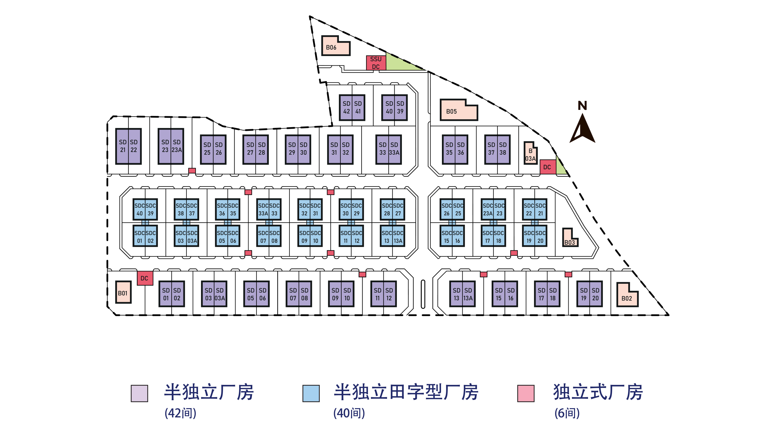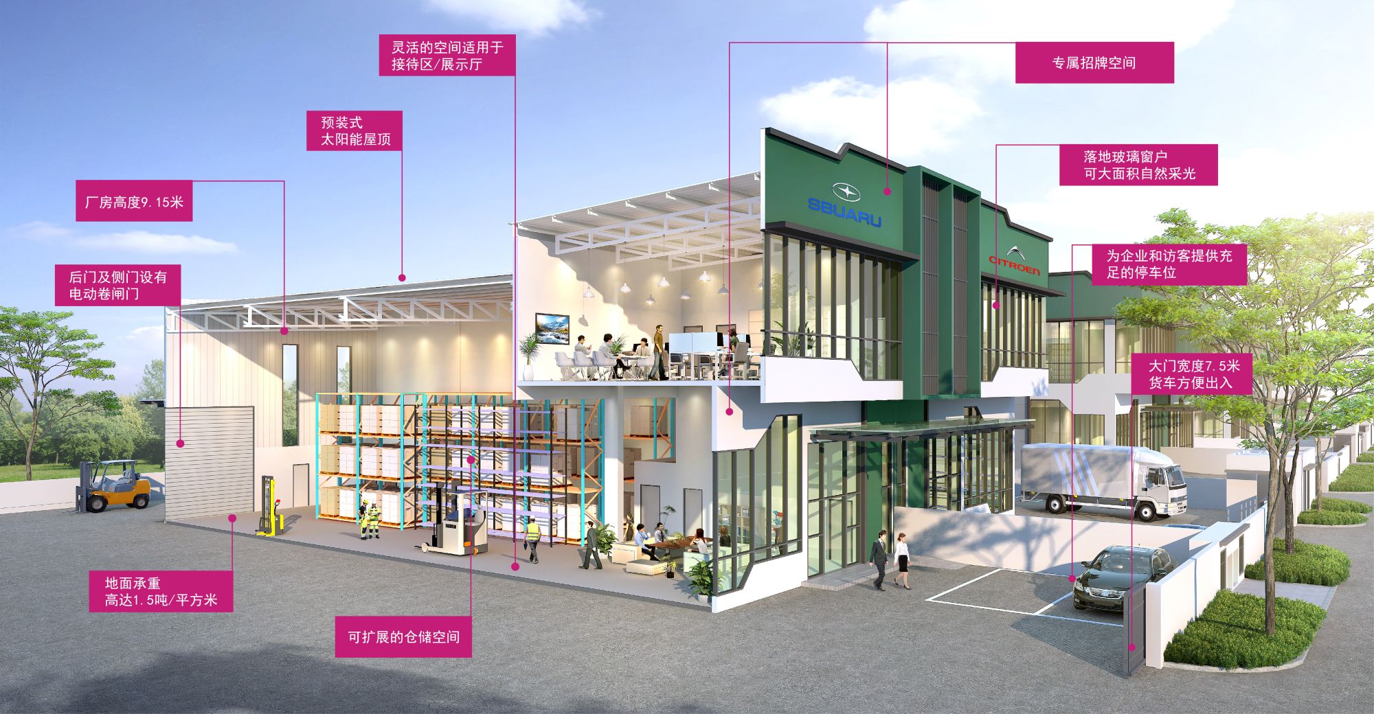 IDEAL BUSINESS HUB 共88个单位,设计包括独⽴式⼚房 、半独⽴⼚房和半独⽴⽥字型⼚房,多样化且灵活的空间布局,让企业可以随着市场需求不断改进与调整。设计兼顾功能与效率,并融⼊可持续的环保实践与绿⾊科技,为园区增添持久吸引⼒。